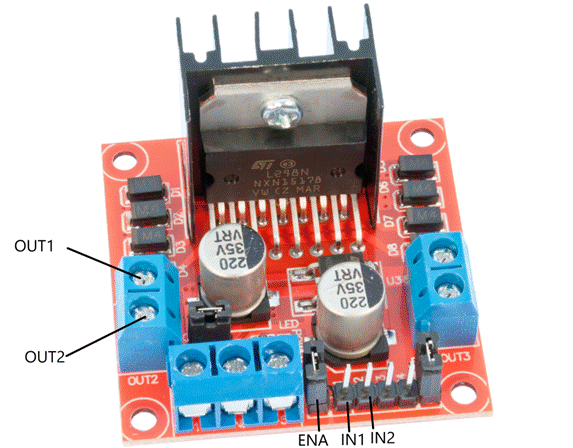 - Enable-pins: There are 2 Enable pins, ENA & ENB. Each enable pin is designed to control two output pins in order to control which output pin remains HIGH to control the motor.